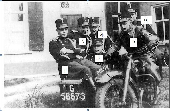 The  next photo, taken at a jovial moment, shows a group of marechaussees who have all piled on their  single motorcycle, a BMW.  The photo most likely was taken in either Baarle-Nassau or Hilvarenbeek.  Karst Smit, wearing an overcoat, is shown in the driver’s seat.  I would like to be certain of the identity of the other men and would welcome assistance in identifying them.   The person labeled as #2 was identified as Albert Wisman by his nephew, Henk van den Elst, in September 2017.  (In a different photo of Wisman and Karst Smit, Wisman does appear to be the same person as #2 below.)  Tentative identifications of #’s 1, 4, and 6 were made by former marechaussee Oscar Lippens in an interview by Jos van Roozendaal.  Marechaussee #5 was confirmed by Lippens as Karst Smit.  Marechaussee #4 was identified as Albert Wisman by his son, Richard Wisman, on Jan. 17, 2021.  But Marechaussee #4 was tentatively identified as David Jonkers by his son.  They are as follows: