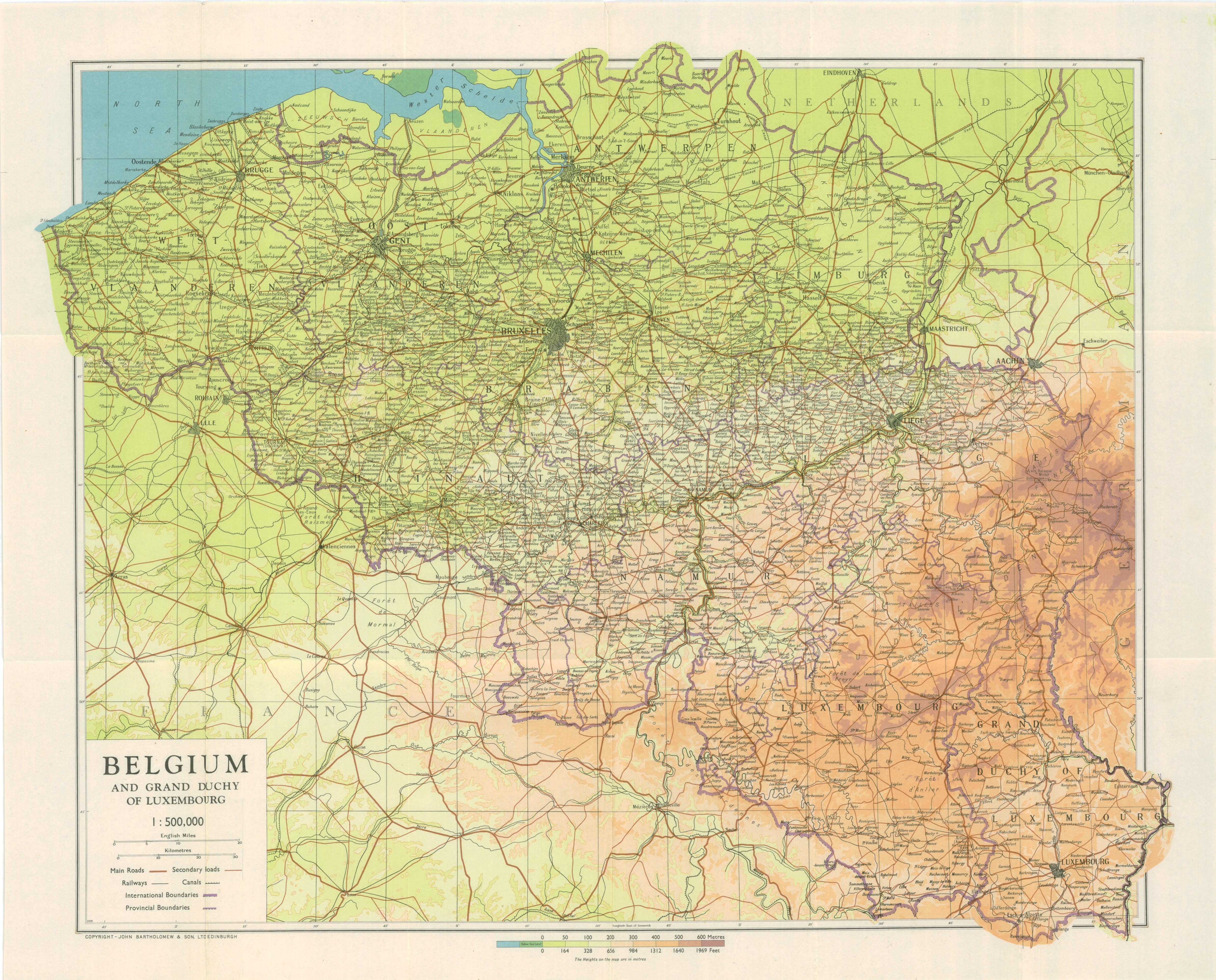 My thanks to Collins Bartholomew Ltd. for permission to reproduce their copyrighted 1944 map of Belgium. It was originally published by John Bartholomew & Son Ltd Edinburgh, probably around 1944. It was found in a pocket on the inside back cover of the book, Belgium, published by Naval Intelligence Division, Geographical Handbook Series, February 1944. To view the map in greater detail, click on it once, then click on it a second time. The second click will provide a highly detailed view. Using your mouse, you should be able to scroll up and down and drag the map from side to side. Locate Antwerp and follow the road northeast to Turnhout. If you continue north to the Dutch border you pass through Ravels, Poppel, and Weelde. Poppel and Weelde figure prominently in the story of the Smit-Van der Heijden Line as did Baarle-Hertog, the Belgian town in The Netherlands, west of Poppel and Weelde.