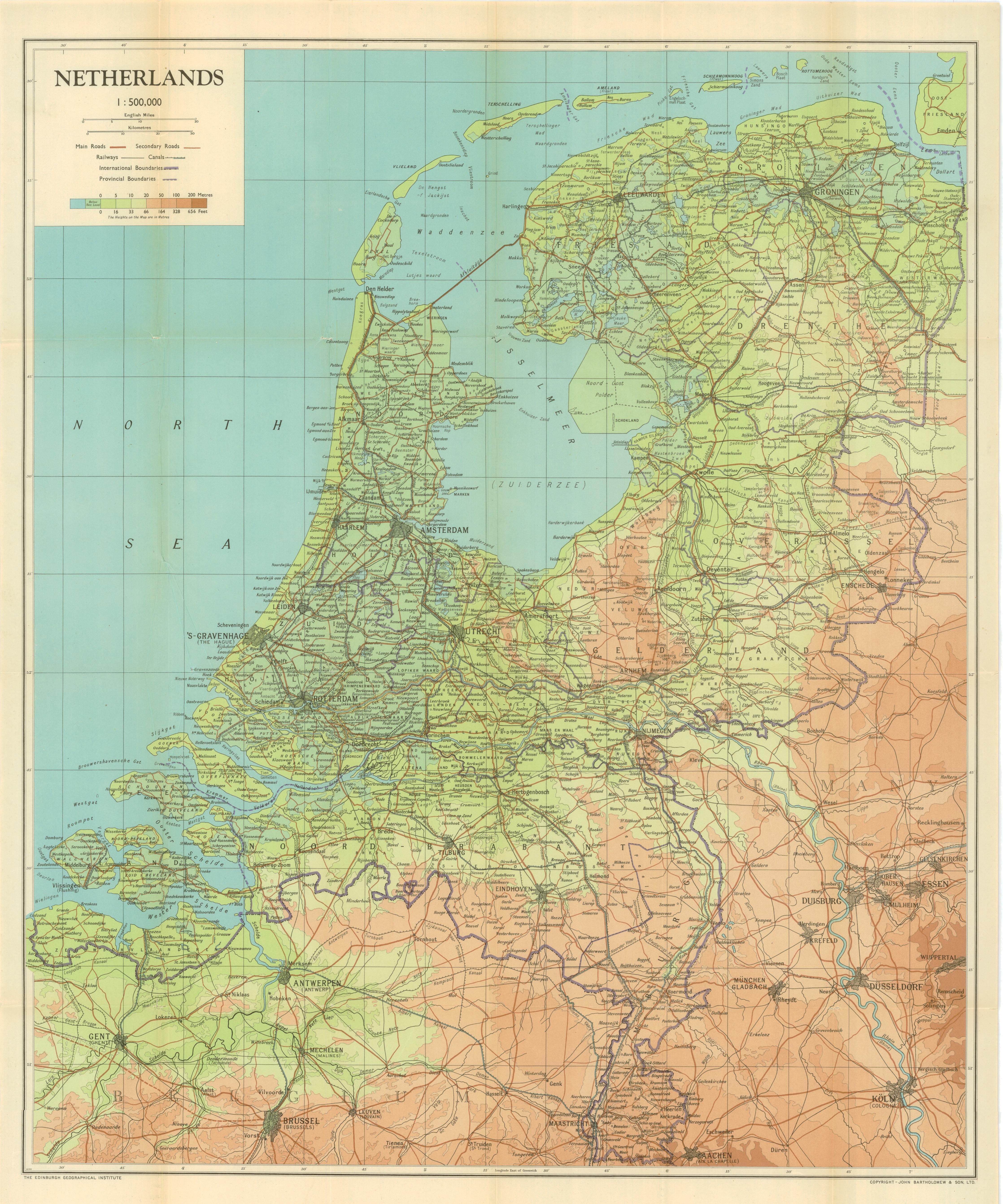 My thanks to Collins Bartholomew Ltd. for permission to reproduce their copyrighted 1944 map of The Netherlands. It was originally published by John Bartholomew & Son Ltd Edinburgh, probably around 1944. It was found in a pocket on the inside back cover of the book, Netherlands, published by Naval Intelligence Division, Geographical Handbook Series, October 1944. To view the map in greater detail, click on it once, then click on it a second time. The second click will provide a highly detailed view. Using your mouse, you should be able to scroll up and down on the map and drag it from side to side. If you follow the line labeled “30′” that passes through Middleburg and Bergen-op-Zoom on the west edge of the map to the point where it is just south of Tilburg, you can see the communities of Baarle-Nassau/Baarle-Hertog, Goirle, Hilvarenbeek, and Esbeek from which members of the Smit-Van der Heijden Line guided escaped French POWs, Dutch Jews, Engelandvaarders, and Allied airmen across the border to Brussels via Turnhout and Antwerp. For a link to additional maps of The Netherlands, click here.